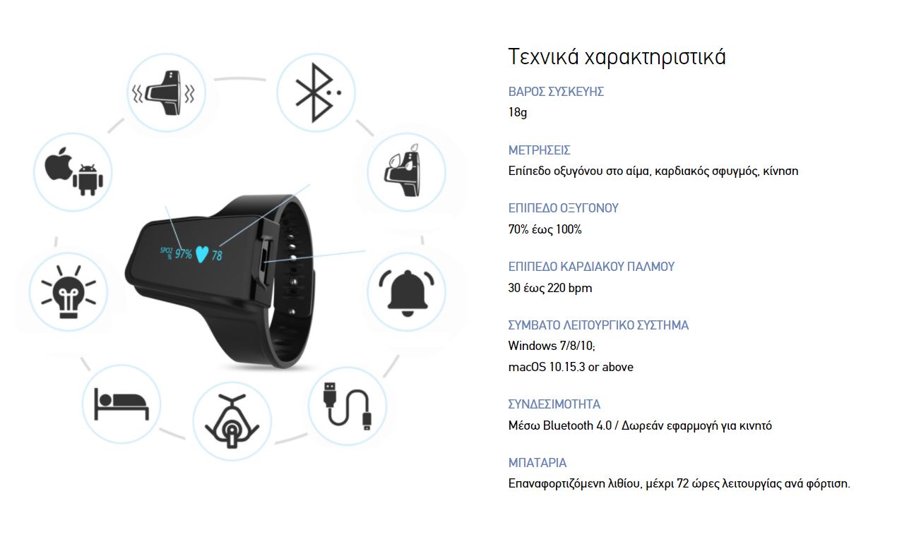 H συσκευή παρακολουθεί το επίπεδο κορεσμού του οξυγόνου στο αίμα, τον καρδιακό ρυθμό, αυτόματα και με ακρίβεια.